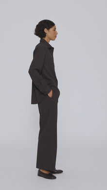 Oversize’owa koszula o prostym kroju, uszyta z lekkiej wełny virgin. Klasyczny kołnierz i mankiety z guzikami nadają jej ponadczasowy charakter, a karczek z kontrafałdą z tyłu zapewnia swobodę ruchu. Kolor to nietypowy odcień grafitowego brązu – łączy w sobie głębię grafitu z subtelnym, ciepłym tonem brązu, co sprawia, że tkanina zmienia odbiór w zależności od światła.