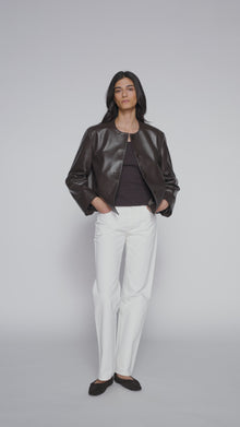Kurtka Marcus uszyta z wysokiej jakości naturalnej skóry o gładkim wykończeniu. Model o prostej, lekko skróconej formie z okrągłym dekoltem i zapięciem na guziki.