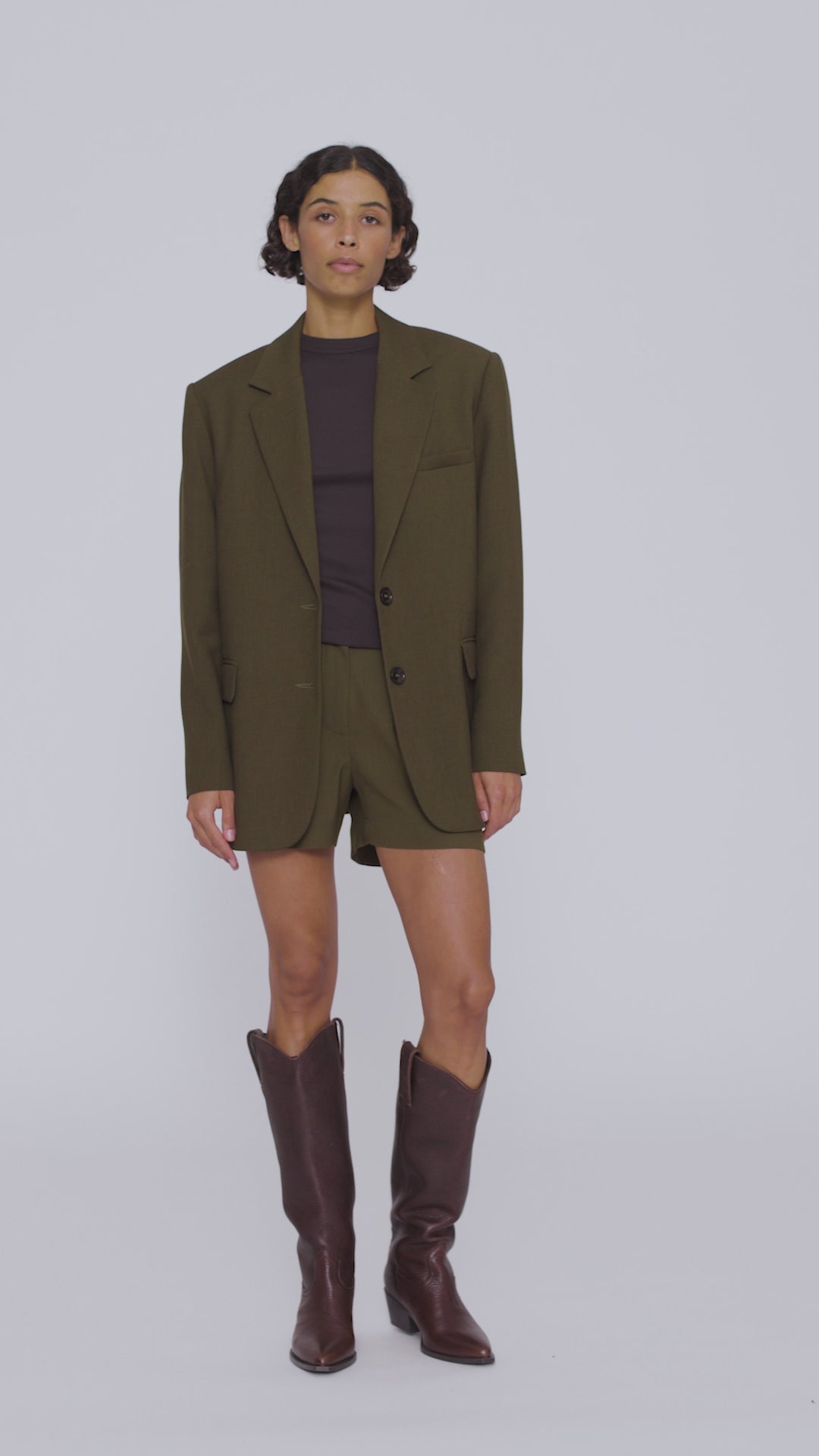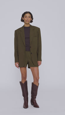 Marynarka SCOTT o lekko oversize'owym kształcie, uszyta z zielonej tkaniny premium z mieszanki wełny i wiskozy. Strukturalne ramiona nadają jej wyrazistości, a lekka konstrukcja sprawia, że doskonale układa się na sylwetce. Klasyczne klapy, zapięcie na dwa guziki oraz trzy kieszenie podkreślają jej ponadczasowy charakter. Rozporek z tyłu zapewnia swobodę ruchu i dodaje lekkości. Aby uzyskać kompletny zestaw, połącz z szortami Lucky.