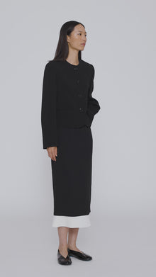 STEEL to krótka marynarka o minimalistycznym fasonie, uszyta z gładkiej tkaniny o zwartej strukturze. Okrągły dekolt bez klap nadaje jej nowoczesny charakter, a pionowe cięcia podkreślają czystą linię projektu. Model zapinany jest na cztery guziki, z dwiema kieszeniami z wypustką. Dzięki prostemu krojowi marynarka sprawdzi się zarówno w komplecie ze spódnicą, jak i w codziennych zestawach z denimem czy szerokimi spodniami.