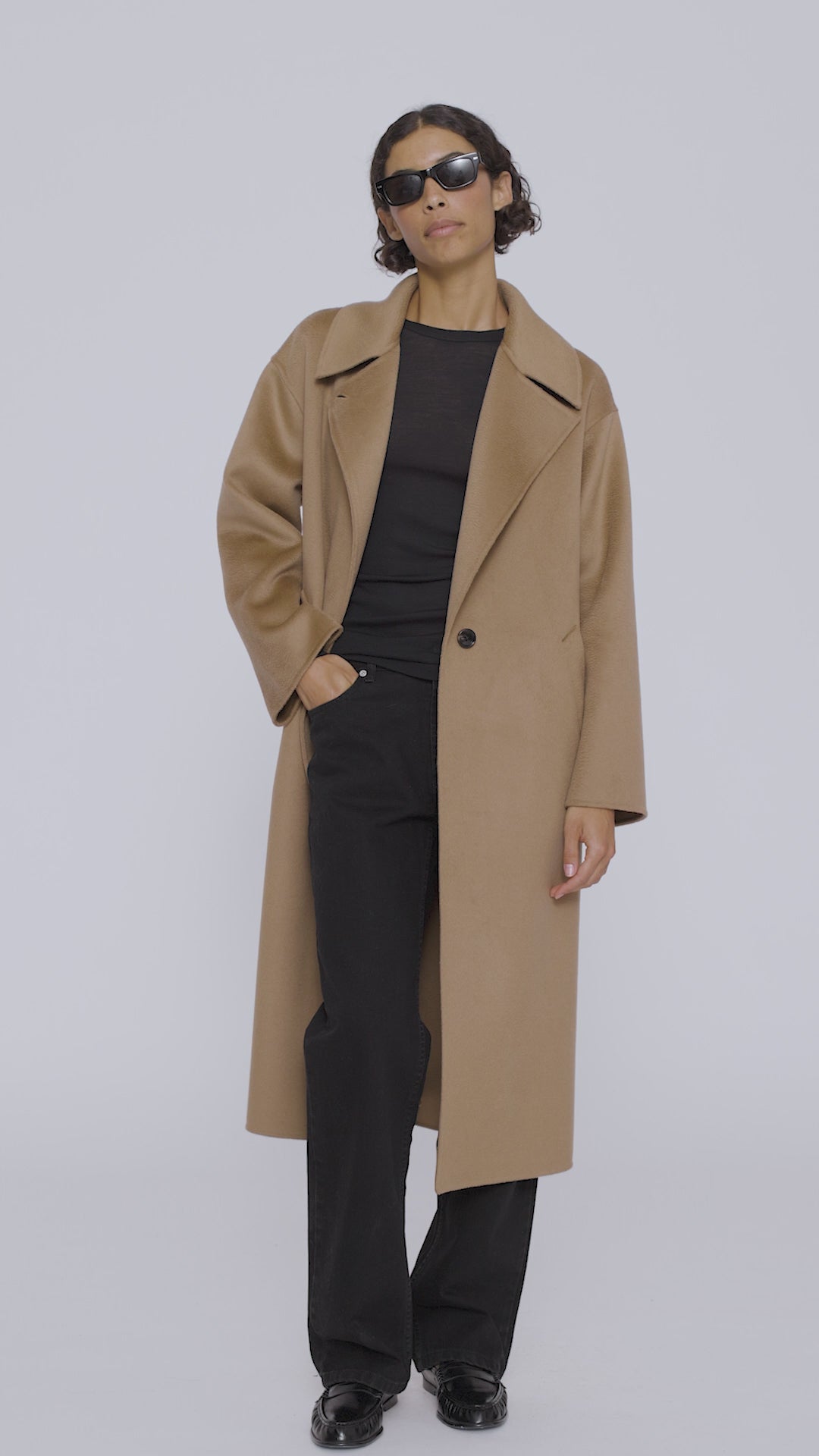 Długi płaszcz CARTER o prostej, lekko luźnej formie, wykonany z wełny typu double face – dwie warstwy materiału są ręcznie łączone, dzięki czemu płaszcz nie wymaga podszewki i zyskuje czyste, wyrafinowane wykończenie od wewnątrz. Pozostaje lekki, a jednocześnie ciepły i stabilny w formie. Szeroki kołnierz i kryte guziki podkreślają jego minimalistyczny charakter. Dostępny w dwóch kolorach.