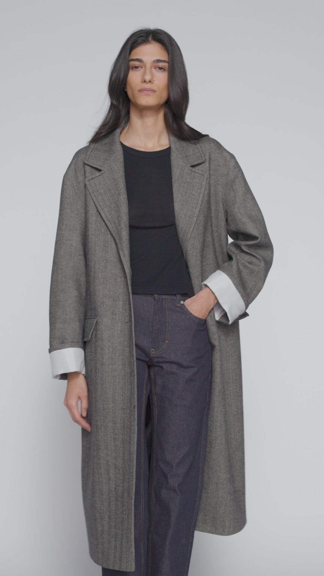 Płaszcz Merith o wydłużonej, prostej sylwetce z opadającą linią ramion i wywiniętymi mankietami wykończonymi detalem. Uszyty z wełnianej tkaniny z dodatkiem wiskozy. Model z klasycznymi klapami i zapięciem na guziki, wykończony wiskozową podszewką.
